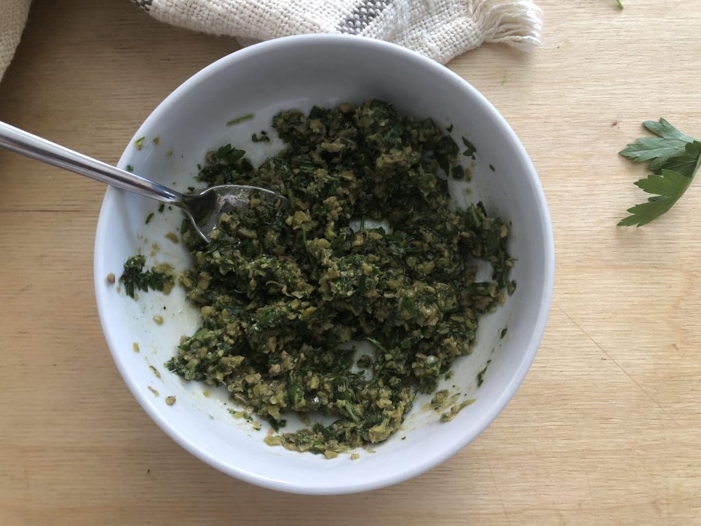 Transférer le hachis dans une petite coupelle et ajouter quelques cuillères d’huile et une pincée de poivre noir. Assaisonner de sel uniquement si nécessaire (je n’en ai pas ajouté car les câpres et les anchois sont déjà très salés).