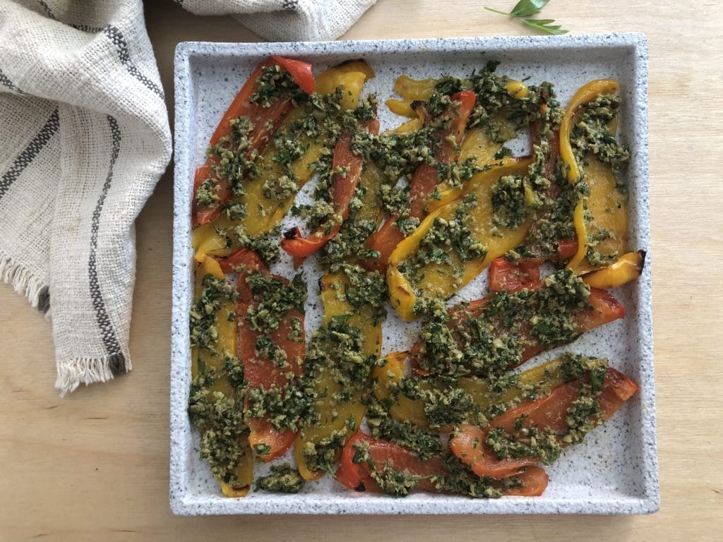 Qu’est-ce qui mijote aujourd’hui? Eh bien… rien en fait. Aujourd’hui, je vous propose un accompagnement simple mais plein de saveur : mes poivrons savoureux. Ils doivent être cuits au four (ou grillés sur une poêle à griller), pelés et assaisonnés avec une sauce parfumée à base de persil, ail, câpres, anchois et olives vertes. Un plat méditerranéen, coloré et irrésistible, parfait pour accompagner des plats de viande ou de poisson, mais aussi excellent en entrée sur une tranche de pain croquant. Ils sont faciles à préparer et idéaux à servir chauds ou froids. Je vous garantis qu’ils remporteront un franc succès et séduiront tout le monde avec leur saveur qui évoque l’été.