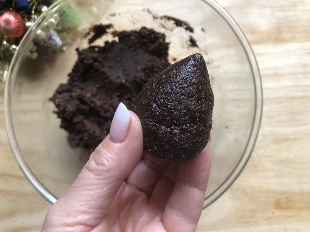 Prendre 50 g de pâte et façonner une petite pyramide entre les mains. Si vous le souhaitez, vous pouvez réaliser des pommes de pin encore plus grandes. Moi j’ai préféré une taille adaptée à une portion individuelle. Si la pomme de pin est trop grande, effectivement, une personne ne peut pas la manger en entier et doit la couper en deux. Cependant, c’est à vous de décider. Vous pourriez aussi envisager de réaliser des pommes de pin de différentes tailles.