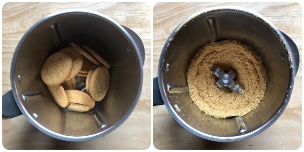 Mettre les biscuits Digestive dans un mixeur et les réduire en poudre fine. Moi, j’ai utilisé le Thermomix en mixant pendant 10 secondes à vitesse 6.
