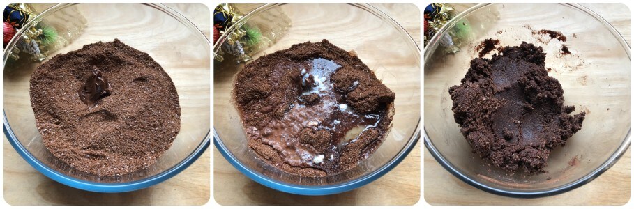 Ajouter ensuite la crème de noisettes, le beurre fondu et le lait, puis pétrir le tout avec les mains ou avec une spatule. Si le mélange semble trop friable et difficile à compacter, ajoutez encore un peu de lait.