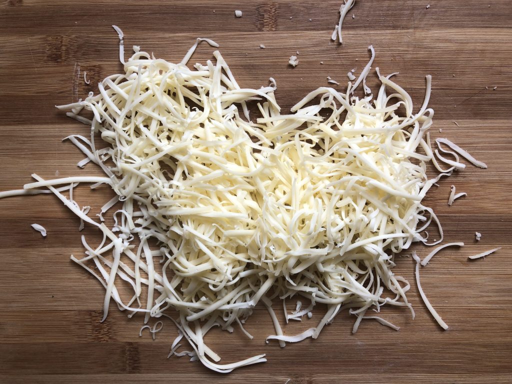 Pendant que les pommes de terre cuisent, beurrer un plat à gratin (le mien a un diamètre de 28 cm) et râper le fromage en julienne (vous pouvez aussi le couper en dés, si vous préférez).