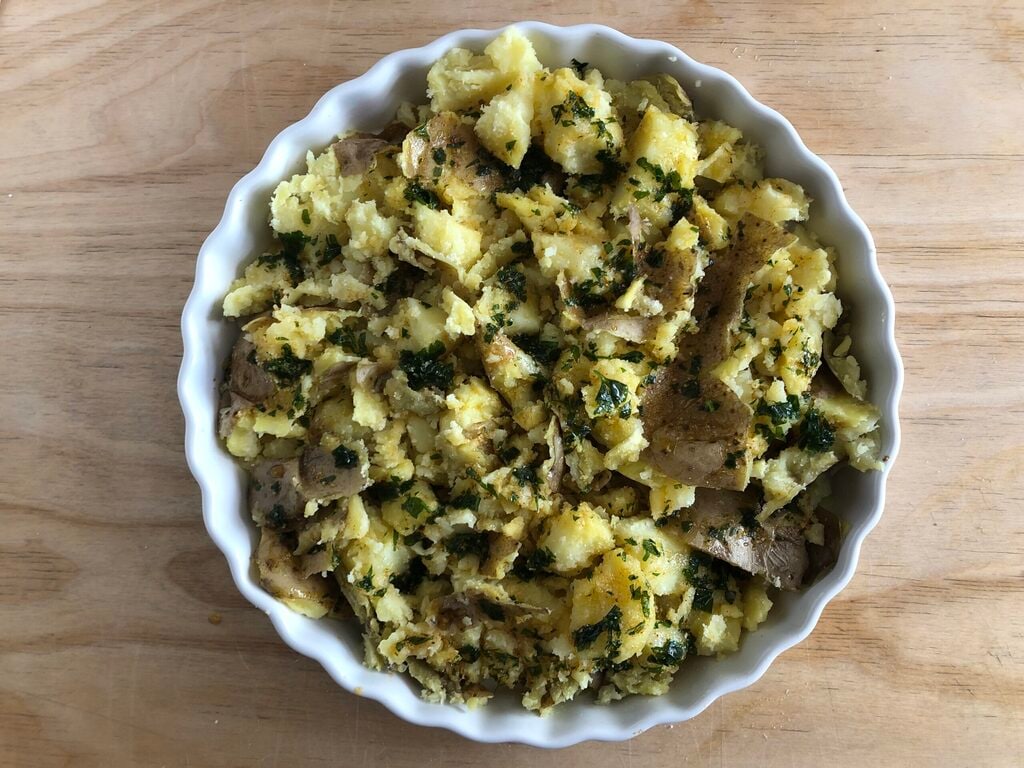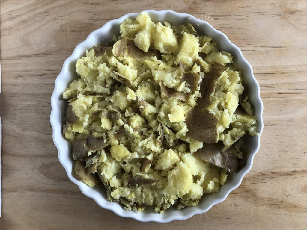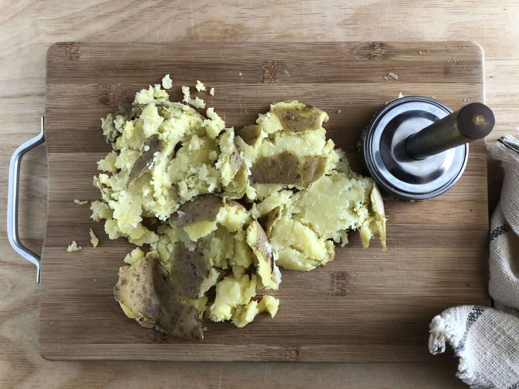 Quand toutes les pommes de terre seront cuites, les écraser avec une pilonneuse ou un verre sans enlever la peau.