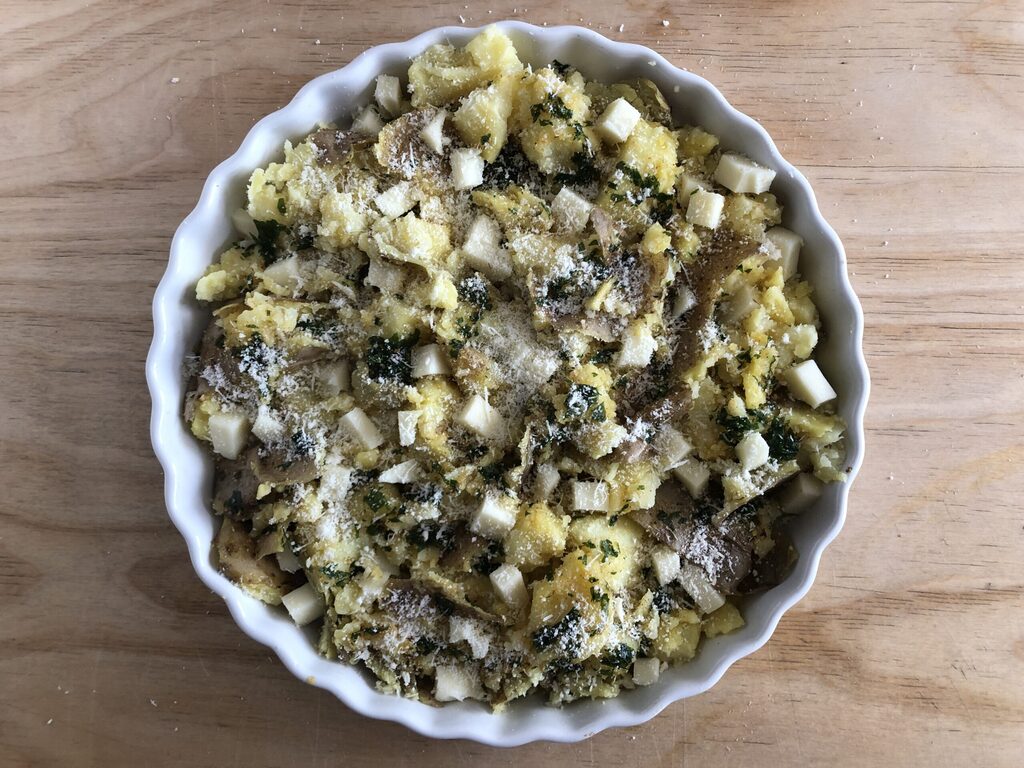 Enfin, insérer ici et là la scamorza préalablement coupée en dés et parsemer toute la surface de fromage râpé : j’en ai mis environ 15 g.
