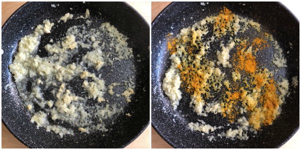 Dans le fond de cuisson, mettez l’oignon et le gingembre hachés et faites-les cuire pendant quelques minutes. Ensuite, ajoutez le curcuma en poudre et mélangez bien.