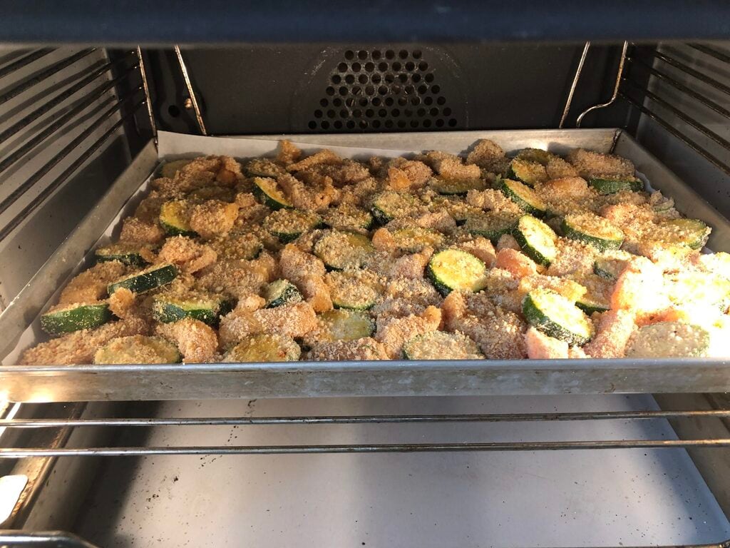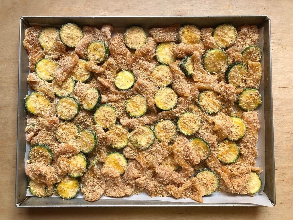 Répartissez le poulet et les courgettes dans un plat recouvert de papier sulfurisé, en essayant de les alterner. Enfin, parsemez le tout avec la panure restante et arrosez d’un filet d’huile.