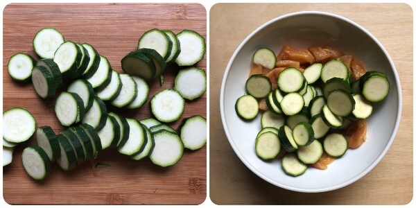 Équeutez les courgettes, lavez-les, séchez-les en les tamponnant avec du papier absorbant et coupez-les en rondelles de 3/4 mm d’épaisseur. Transférez-les ensuite également dans le saladier avec le poulet.