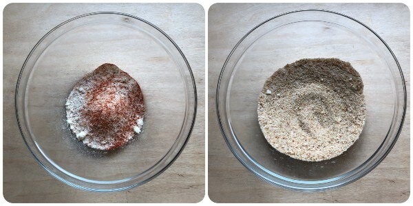Dans un autre bol, mettez la chapelure, le fromage râpé, une pincée de sel, un tour de moulin de poivre noir et beaucoup de paprika, puis mélangez bien le tout.