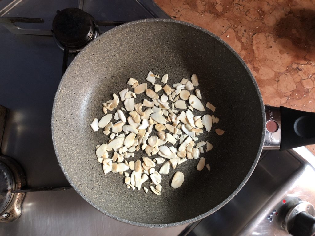• Pendant ce temps, chauffez bien une petite poêle et faites griller les amandes effilées 2–3 minutes. Une fois dorées, retirez-les de la poêle pour éviter qu’elles ne brûlent et réservez-les.