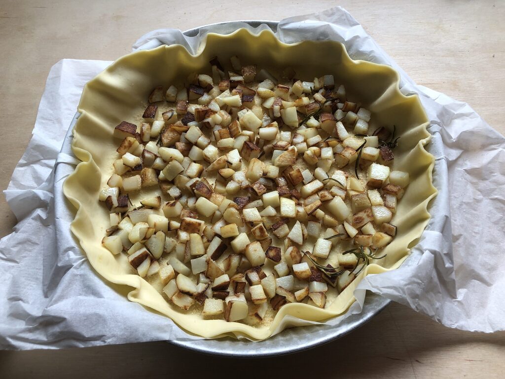 Après avoir retiré les gousses d’ail, transférez les pommes de terre sur le fond de la pâte feuilletée.