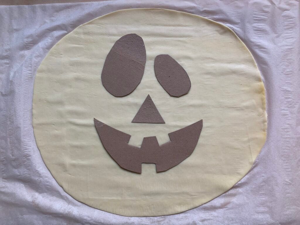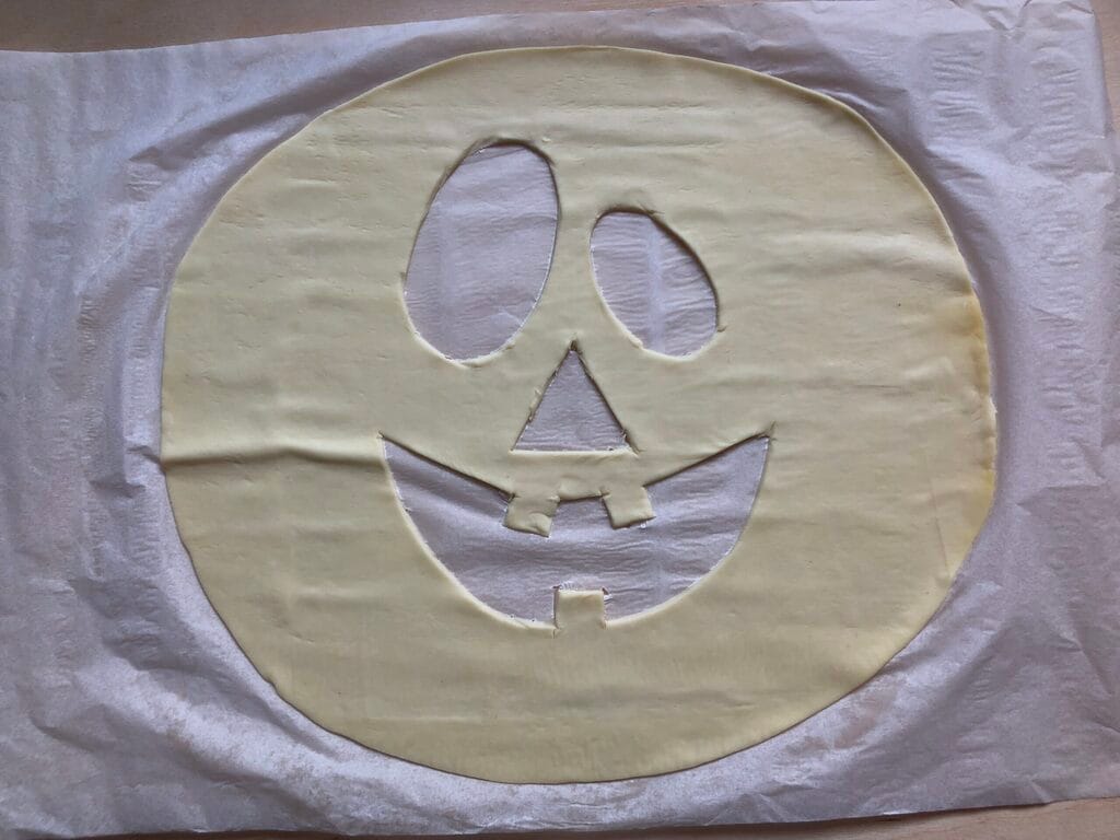 • Premièrement, déroulez un disque de pâte feuilletée en le laissant sur le papier sulfurisé fourni dans l’emballage. Ensuite, avec un petit couteau, découpez les yeux, le nez et la bouche de la citrouille typique. Si vous êtes doué artistiquement, vous pouvez le faire à main levée. Moi, par contre, je suis complètement inapte artistiquement, donc j’ai d’abord tout dessiné sur un carton. J’ai découpé les différentes parties, je les ai posées sur la pâte feuilletée et seulement après, je l’ai incisée. Évidemment, vous pouvez dessiner le nez, la bouche et les yeux comme vous le souhaitez.
