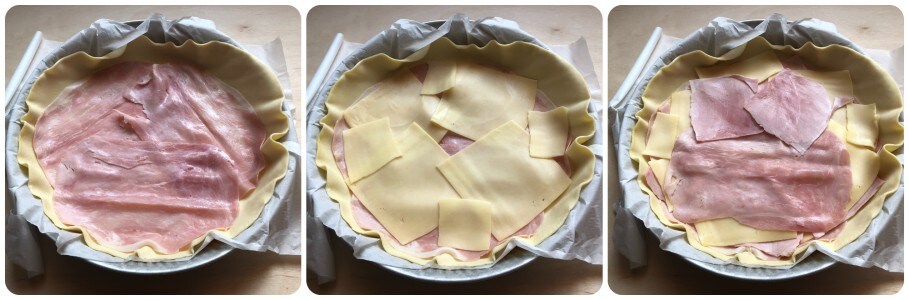 Déroulez le deuxième disque de pâte feuilletée et posez-le à l’intérieur d’un moule à tarte de 26/28 cm de diamètre, sans le retirer du papier sulfurisé. Piquez le fond avec les dents d’une fourchette.