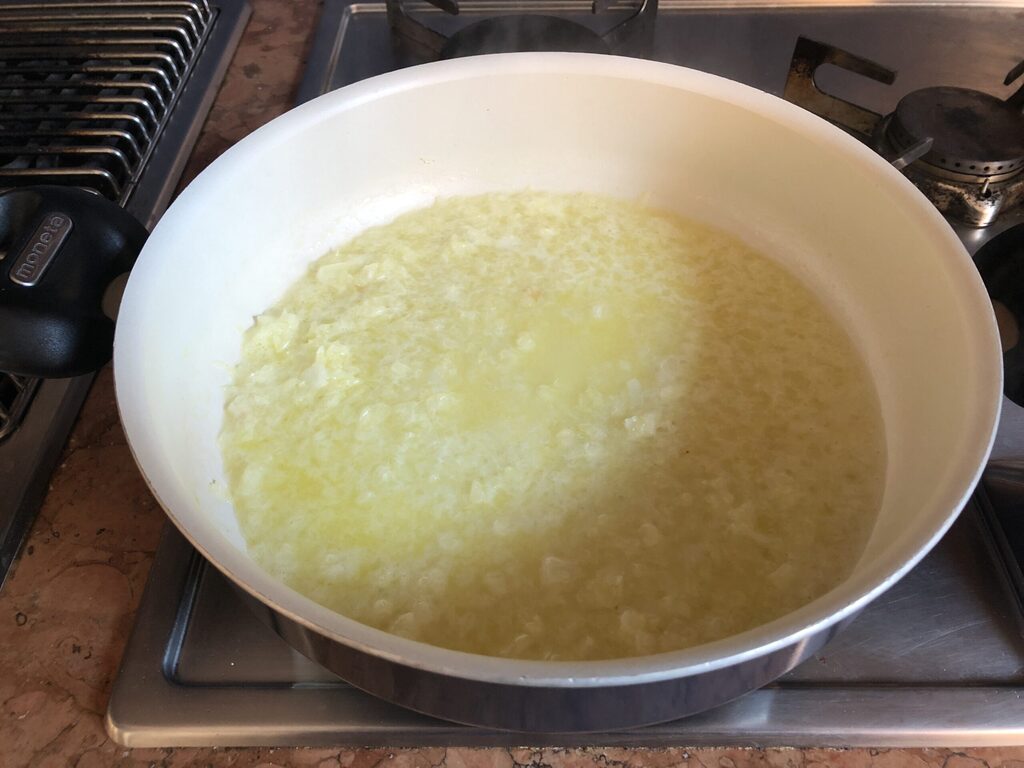 Dans une grande casserole, faire doucement revenir l’oignon avec le beurre, une cuillère à soupe d’huile et quelques cuillères à soupe de bouillon chaud.