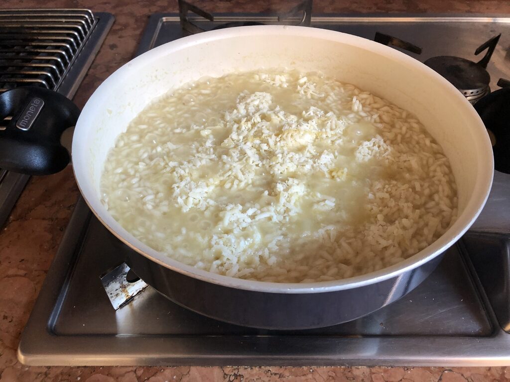 Quand le riz est al dente, mais tendre, éteindre le feu, ajouter le reste du fromage, mélanger, couvrir et laisser reposer 2/3 minutes.