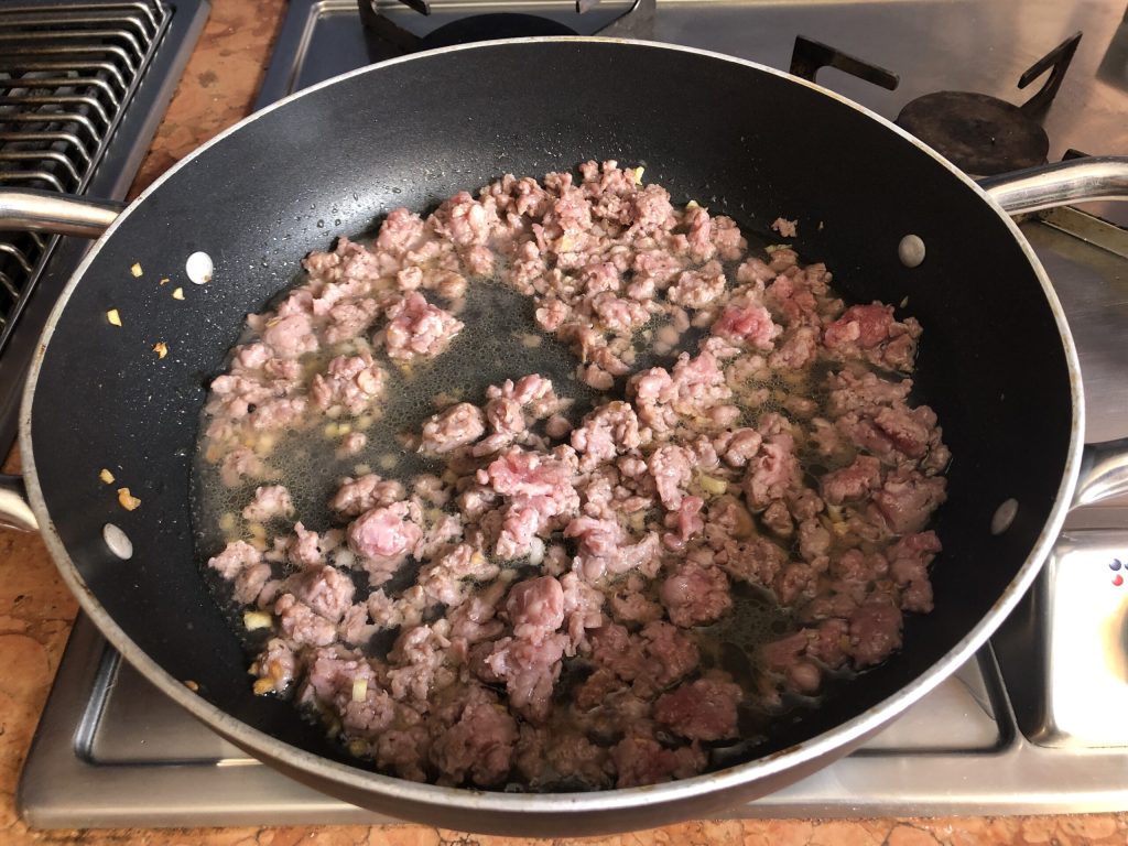 Dans une grande sauteuse, chauffer quelques cuillères d’huile et y faire revenir l’ail haché. Laisser crépiter un instant, puis ajouter les saucisses émiettées.