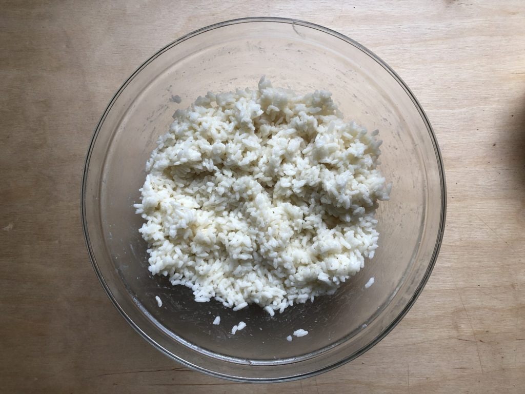 • Beurrer un plat à gratin, y verser le riz assaisonné, le niveler et le saupoudrer du reste du fromage râpé (20 g).