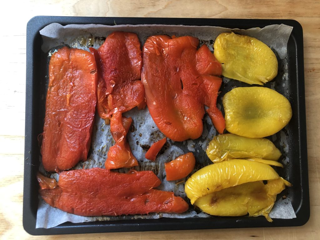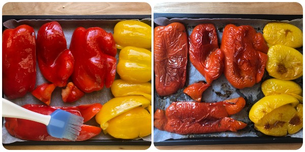 • Les couper ensuite en quartiers et les disposer sur une plaque recouverte de papier sulfurisé. Les badigeonner d’huile et les cuire dans un four préchauffé à 200° jusqu’à ce qu’ils deviennent tendres et que leur peau soit légèrement brûlée. Comptez environ 40/45 minutes.