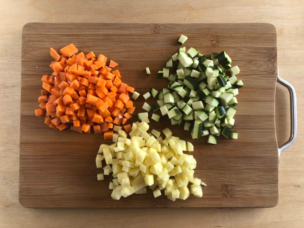 Équeuter la carotte et la gratter. Équeuter aussi la courgette. Peler la pomme de terre. Laver bien tous ces légumes, les sécher en les tamponnant avec du papier absorbant et les couper en petits dés.