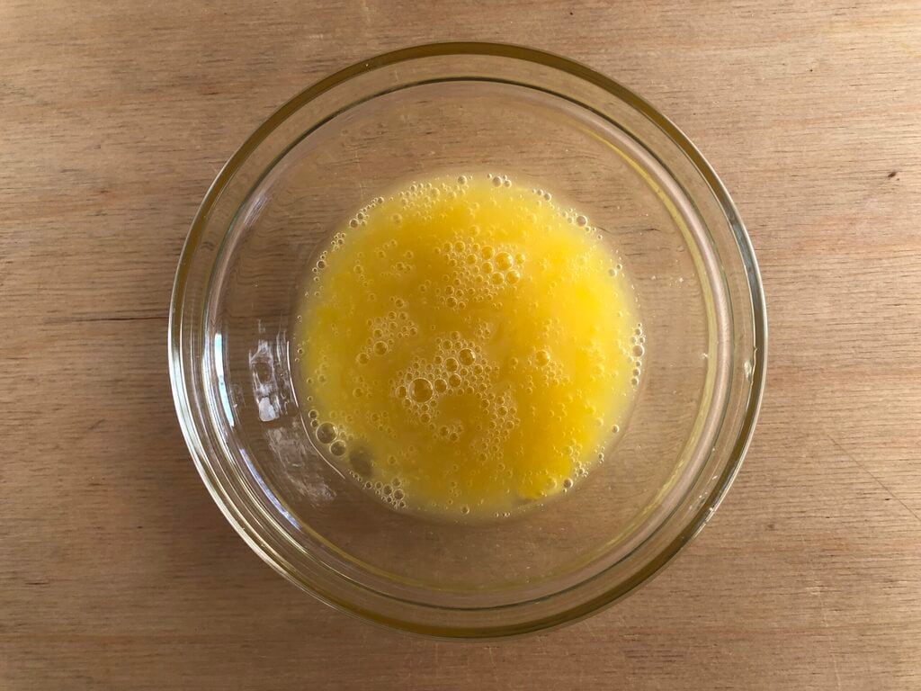 Casser l’œuf dans une petite assiette, ajouter une pincée de sel et le battre avec une fourchette juste le temps de mélanger le jaune et le blanc.