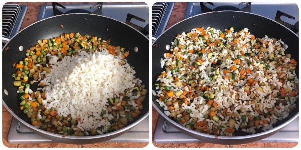 À ce stade, ajouter également le riz bouilli (froid) dans la casserole et le faire sauter rapidement à feu vif, en le remuant continuellement.