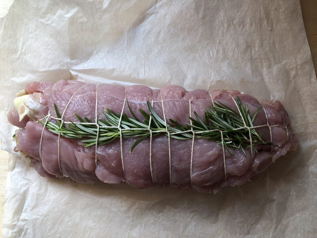 À ce stade, attacher le roulé de dinde avec de la ficelle de cuisine en insérant une branche de romarin comme montré sur la photo.