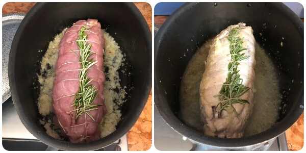 Ensuite, mettre dans la casserole le roulé de dinde, ajouter une généreuse pincée de sel et le faire dorer de tous les côtés avant de l’arroser avec le vin blanc.