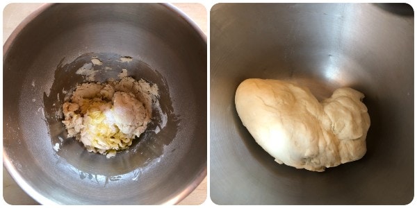 Puis, ajouter l’eau et commencer à pétrir avec le crochet.