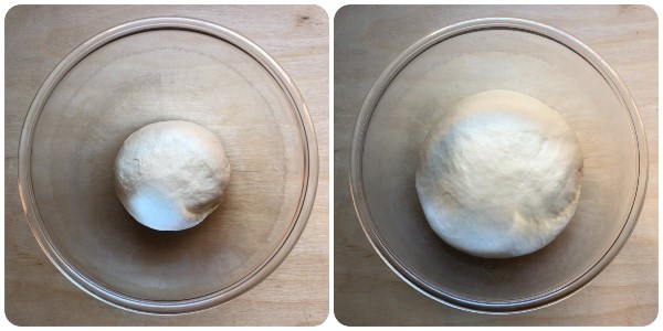 Former une boule, la mettre dans un bol, couvrir et laisser lever jusqu’à ce que le volume double dans un endroit tiède et à l’abri des courants d’air. Le temps de levée dépend beaucoup de la température ambiante et peut varier de 2 à 3 heures.