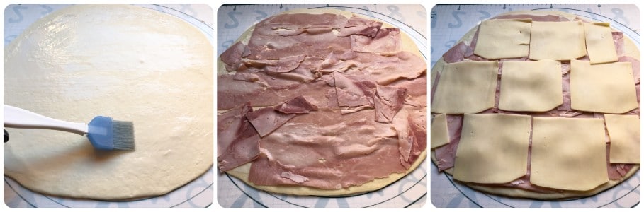 Puis, badigeonner toute la surface avec un peu de lait, puis faire une couche de jambon cuit et une couche de fromage en tranches.