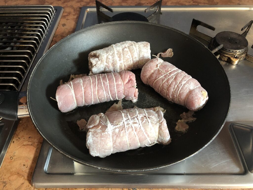 Enfin, enrouler la tranche de veau sur elle-même pour former un roulé et l’attacher avec de la ficelle de cuisine. Répéter l’opération avec les trois autres tranches de viande et repasser les roulés dans la farine en les secouant pour éliminer l’excès.