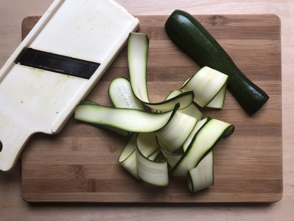 Couper les extrémités des courgettes, les laver, les sécher et les couper en fines tranches dans le sens de la longueur avec une mandoline.