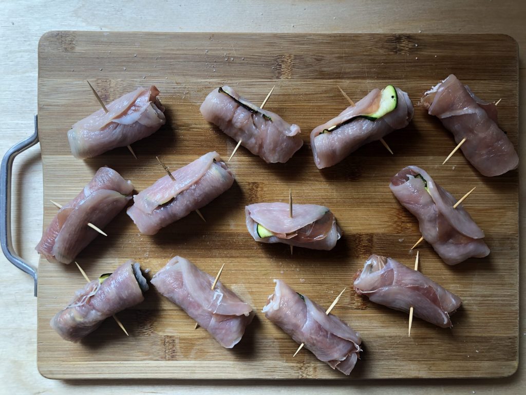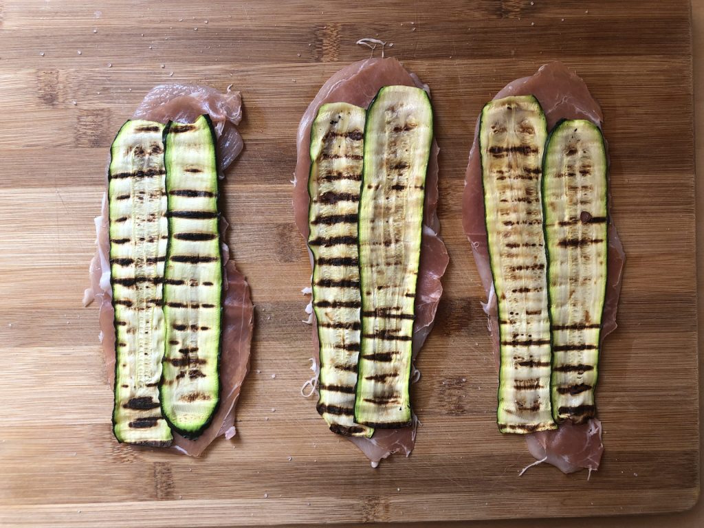 Bien sûr, vous pouvez augmenter ou diminuer les quantités en fonction du nombre de roulés que vous souhaitez préparer, en tenant compte qu’il vous faut une tranche de blanc de poulet + une tranche de jambon cru + 2 tranches de courgettes grillées par roulé.