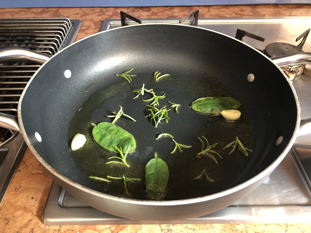 Chauffer quelques cuillerées d’huile dans une large casserole, ajouter la gousse d’ail épluchée et débarrassée de son germe, les aiguilles de romarin et la sauge et laisser frémir un instant.