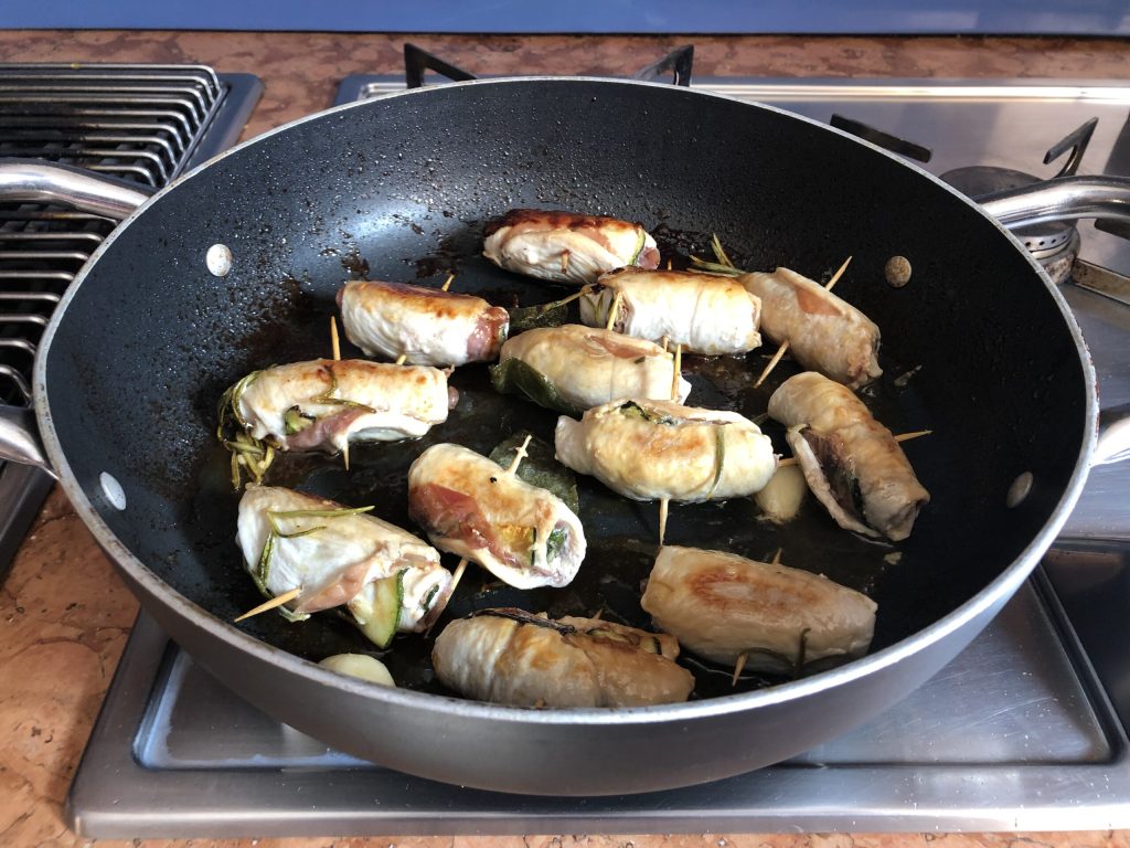 Laisser évaporer un peu le vin à feu vif, puis mettre le couvercle et poursuivre la cuisson à feu doux pendant une dizaine de minutes en retournant les roulés de temps en temps.
