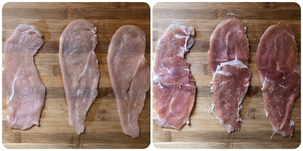 Aplatir les tranches de blanc de poulet pour les rendre aussi fines que possible, les saler légèrement, puis les recouvrir de tranches de jambon cru. On trouve dans le commerce des tranches très fines qui sont parfaites pour cette recette.