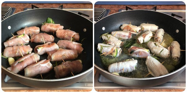 Ajouter ensuite les roulés de viande et les faire dorer de tous les côtés pendant quelques minutes avant de déglacer avec le vin blanc.