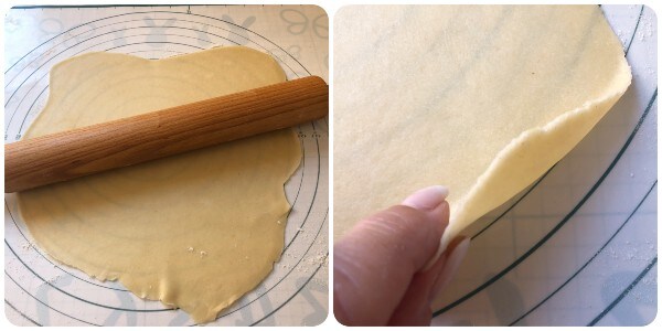 À ce point, prendre un morceau de pâte, l’aplatir avec les mains sur le plan de travail bien fariné et l’étaler avec le rouleau à pâtisserie en une feuille très fine. Même dans ce cas, il ne sera pas nécessaire de donner à la feuille une forme régulière.