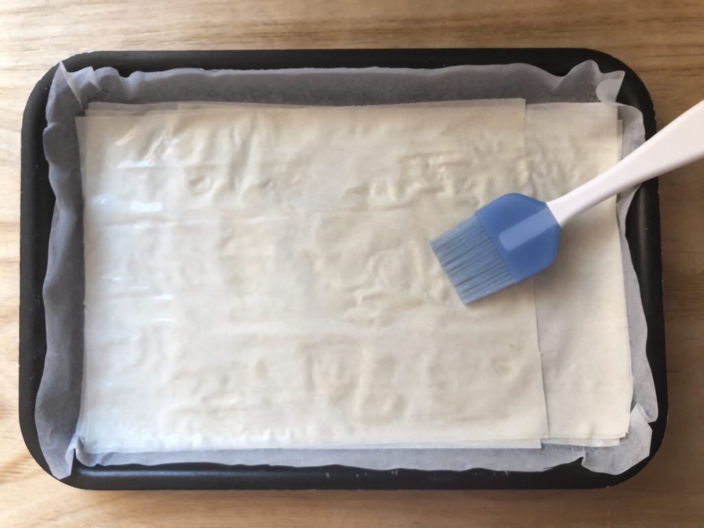 Répéter la même opération avec deux autres feuilles. Au total, la base sera constituée de trois feuilles de pâte filo toutes badigeonnées d’eau.
