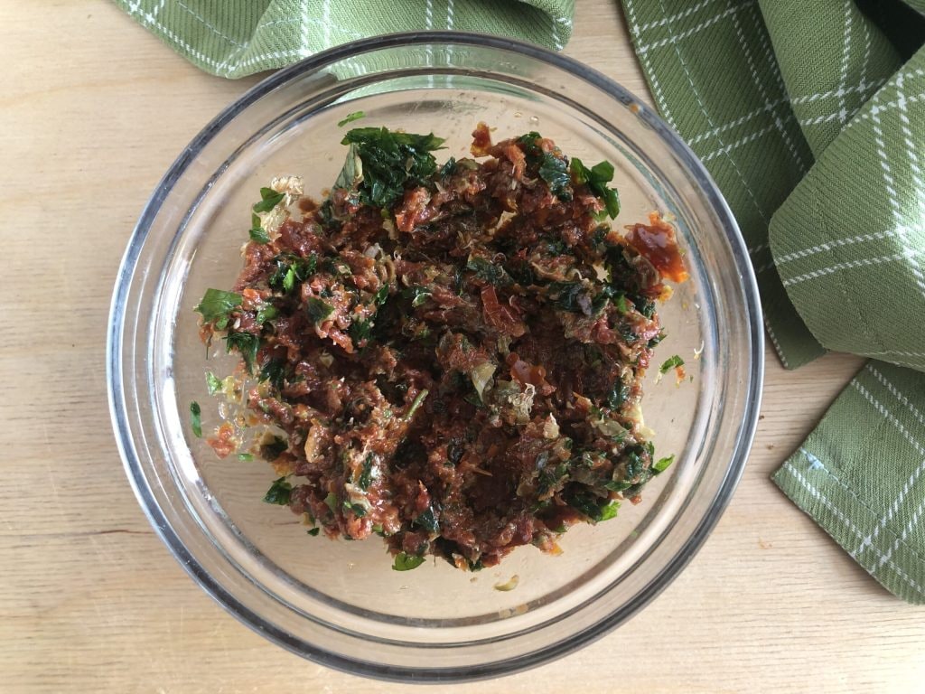 • Égoutter les tomates séchées de l’huile de conservation et les mettre dans un mixeur avec les feuilles de persil préalablement lavées et les câpres dessalées sous l’eau courante. Hacher le tout grossièrement et transférer le hachis dans une petite assiette. Ajouter une cuillère d’huile et mélanger.