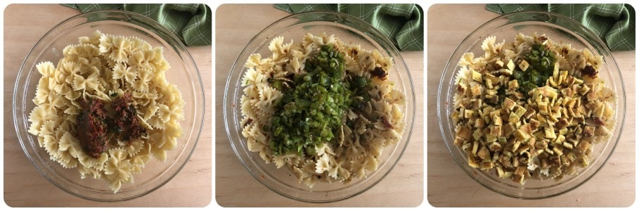 • C’est le moment d’assembler tous les ingrédients : ajouter aux pâtes le hachis de persil, tomates séchées et câpres et mélanger. Puis ajouter les friggitelli et les dés d’omelette.