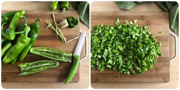 • Laver les friggitelli, enlever la tige et, avec la pointe d’un petit couteau, retirer la partie centrale avec les graines. Les couper ensuite en deux et retirer les filaments blancs et les éventuelles autres graines. Enfin, les couper en petits morceaux.