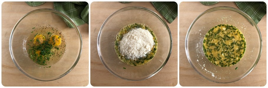 • Casser les œufs dans une terrine, ajouter une pincée de sel, un tour de moulin de poivre noir et la ciboulette préalablement lavée, séchée et ciselée aux ciseaux. Battre le tout avec un petit fouet à main jusqu’à homogénéité des jaunes et des blancs, puis ajouter également le fromage râpé et bien l’incorporer.