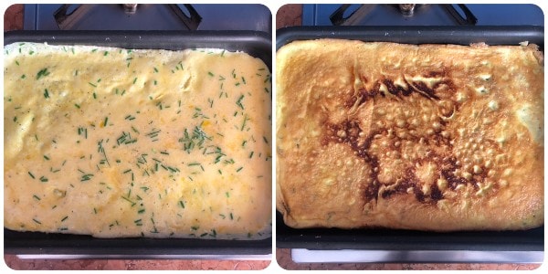 • Chauffer un filet d’huile dans une petite poêle antiadhésive (de préférence rectangulaire de taille 25 x 18 cm) et y cuire une fine omelette en la retournant des deux côtés.