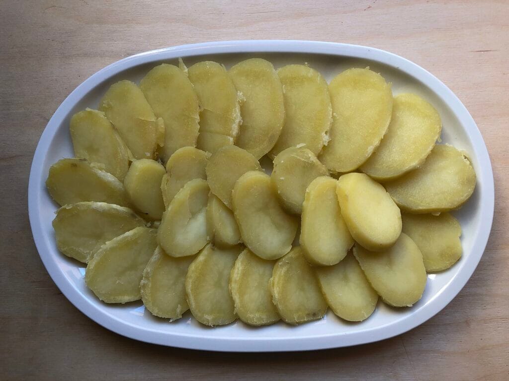 Une fois cuites, les peler et les couper en tranches d’environ 4/5 mm d’épaisseur.