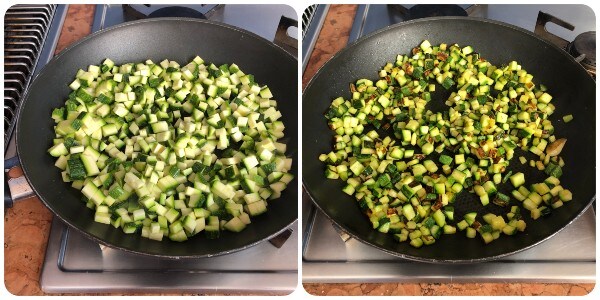 Dans une poêle, chauffer un filet d’huile et y faire revenir une gousse d’ail pelée et entière. Ensuite, ajouter les courgettes et les faire dorer à feu vif pendant une dizaine de minutes en remuant souvent. À la fin de la cuisson, les courgettes doivent être tendres et dorées mais encore croquantes. Saler et poivrer à votre goût et retirer l’ail.
