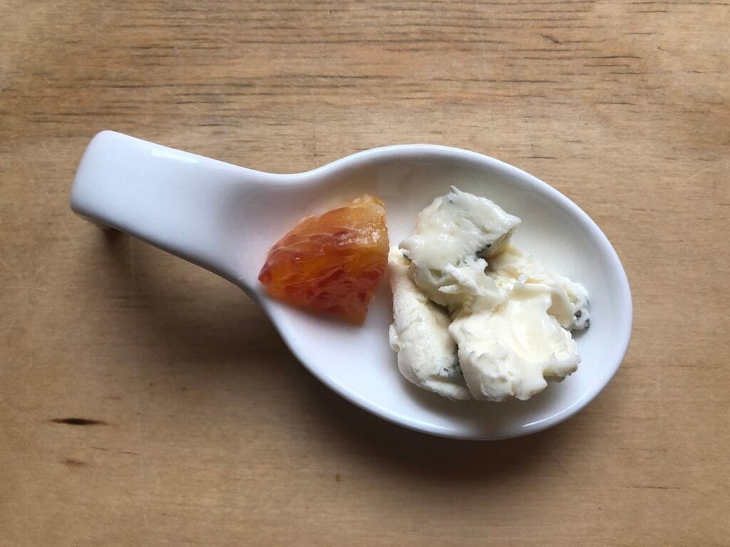 Mettre à l’intérieur d’une petite cuillère individuelle un morceau de quartier d’orange et une noix de gorgonzola au mascarpone. Si vous préférez, vous pouvez utiliser du gorgonzola doux. J’ai choisi celui mélangé au mascarpone car il est un peu plus délicat et je l’ai trouvé plus adapté pour ce type de préparation.