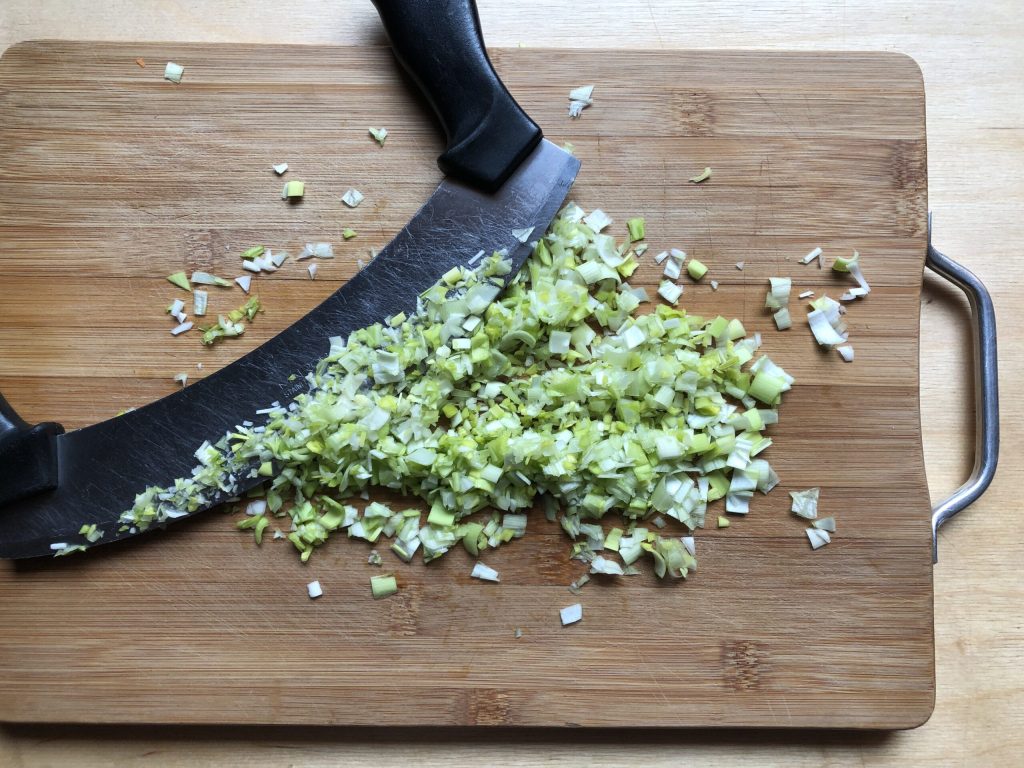 Nettoyer le poireau, en éliminant la partie verte plus foncée et les racines, le couper en rondelles puis le hacher finement. J’ai utilisé un hachoir.
