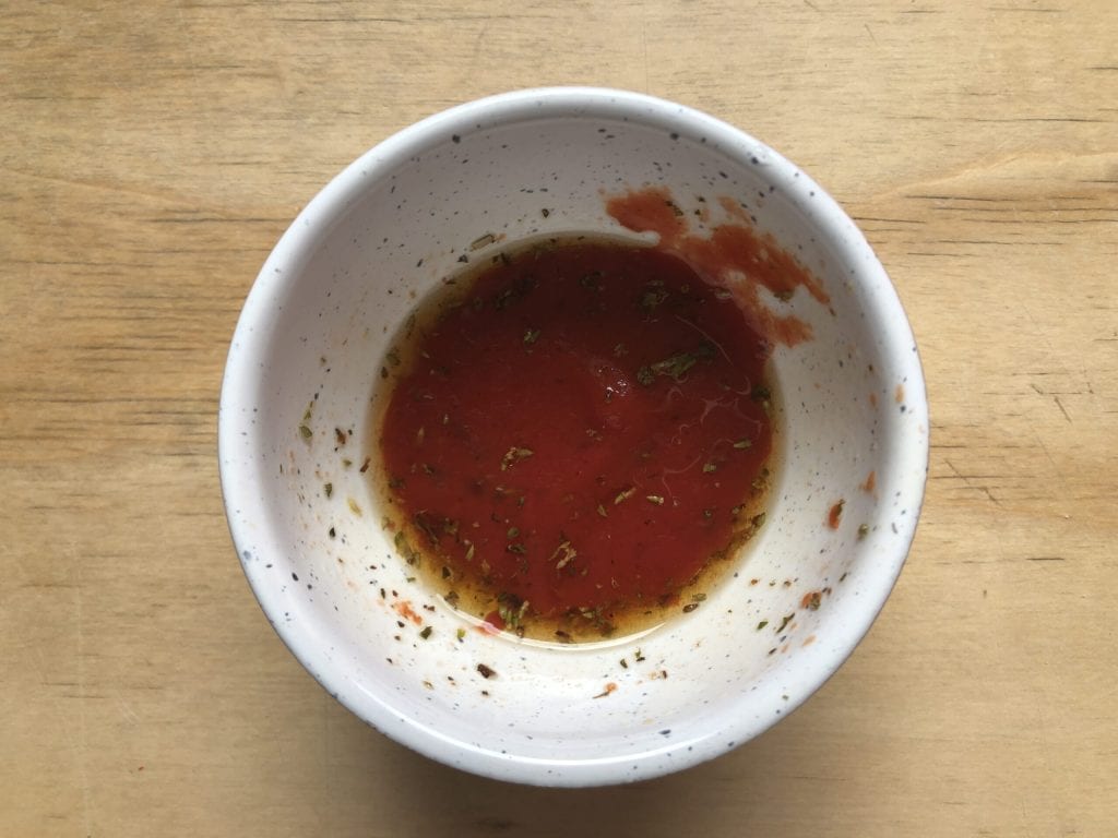 • Dans un petit bol, mélanger une cuillère à soupe généreuse de concentré de tomates avec une cuillère à soupe d’huile, une cuillère à soupe d’eau et une pincée d’origan.