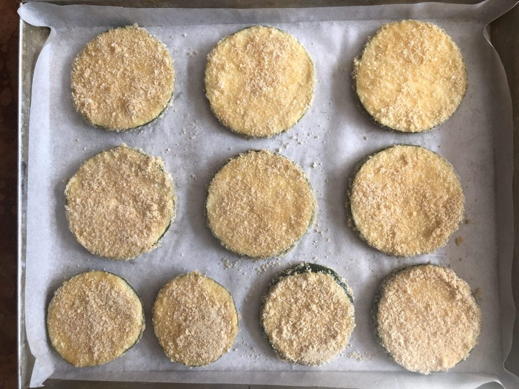À ce stade, passer chaque tranche de courgette d’abord dans les farines, puis dans l’œuf et enfin dans la chapelure.