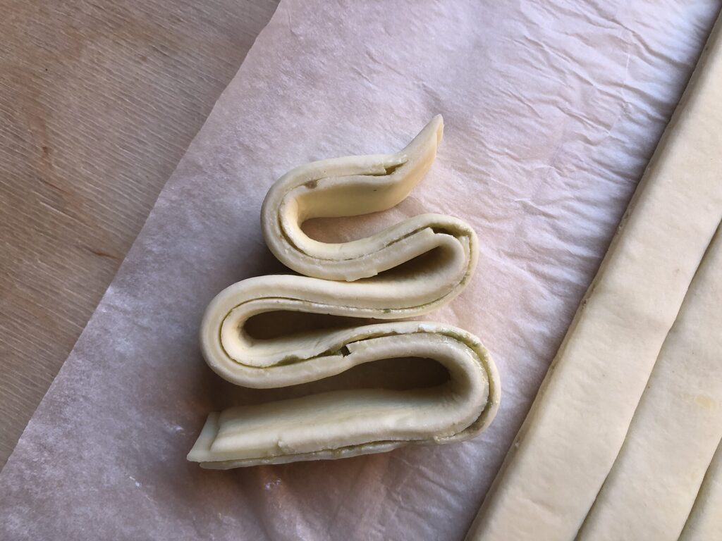 Dérouler le rectangle de pâte feuilletée en le gardant posé sur le papier sulfurisé fourni avec l’emballage, puis en enduire la moitié avec du pâté d’olives vertes (cela fonctionne aussi avec celui d’olives noires, qui est peut-être plus facile à trouver).